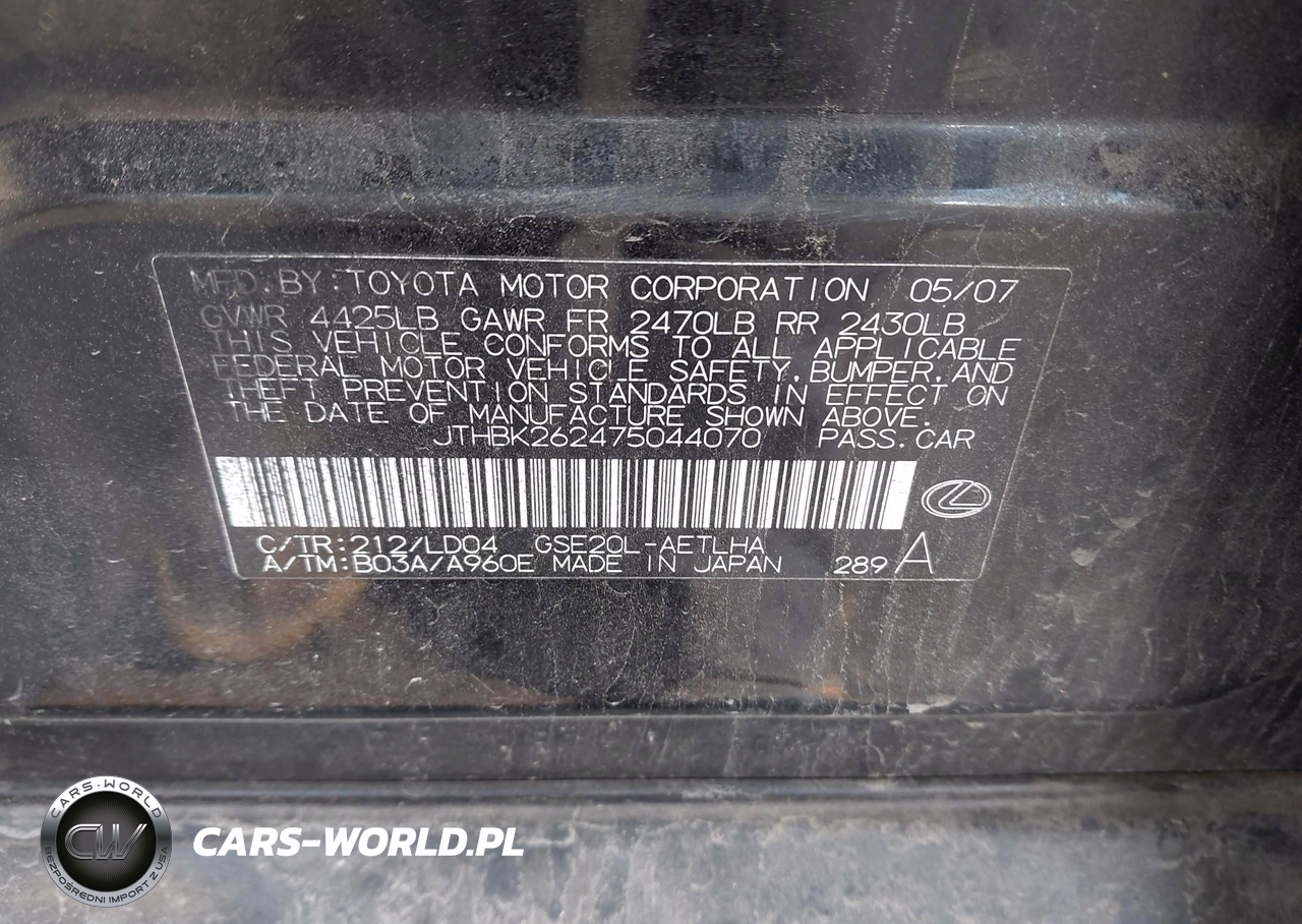 IAAI Nr: I-44560094 VIN: JTHBK262475044070 Port: Elizabeth, NJ