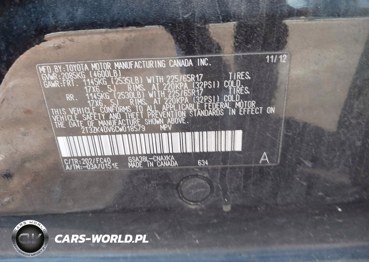 IAAI Nr: I-44565039 VIN: 2T3ZK4DV6CW018579 Port: Savannah, GA