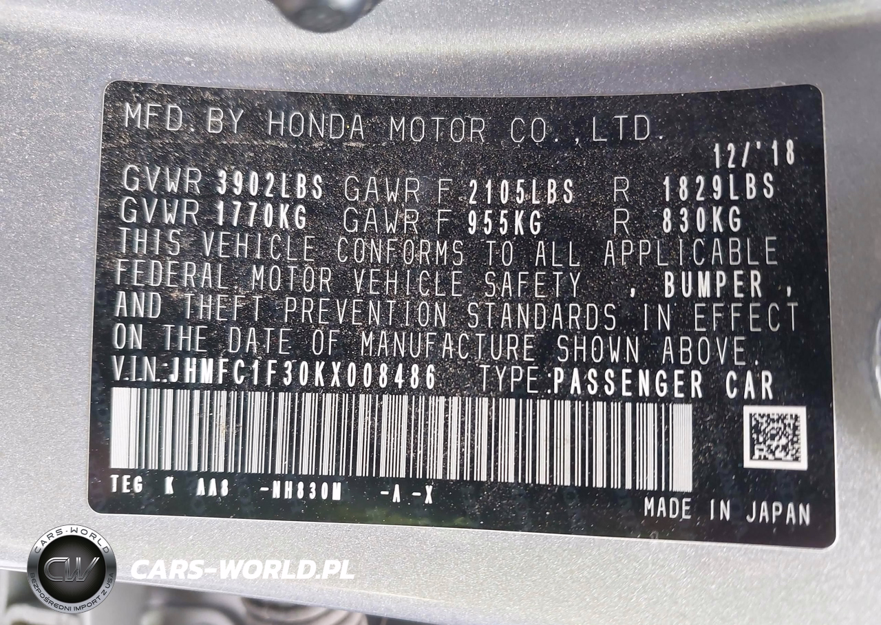 IAAI Nr: I-44572608 VIN: JHMFC1F30KX008486 Port: Savannah, GA