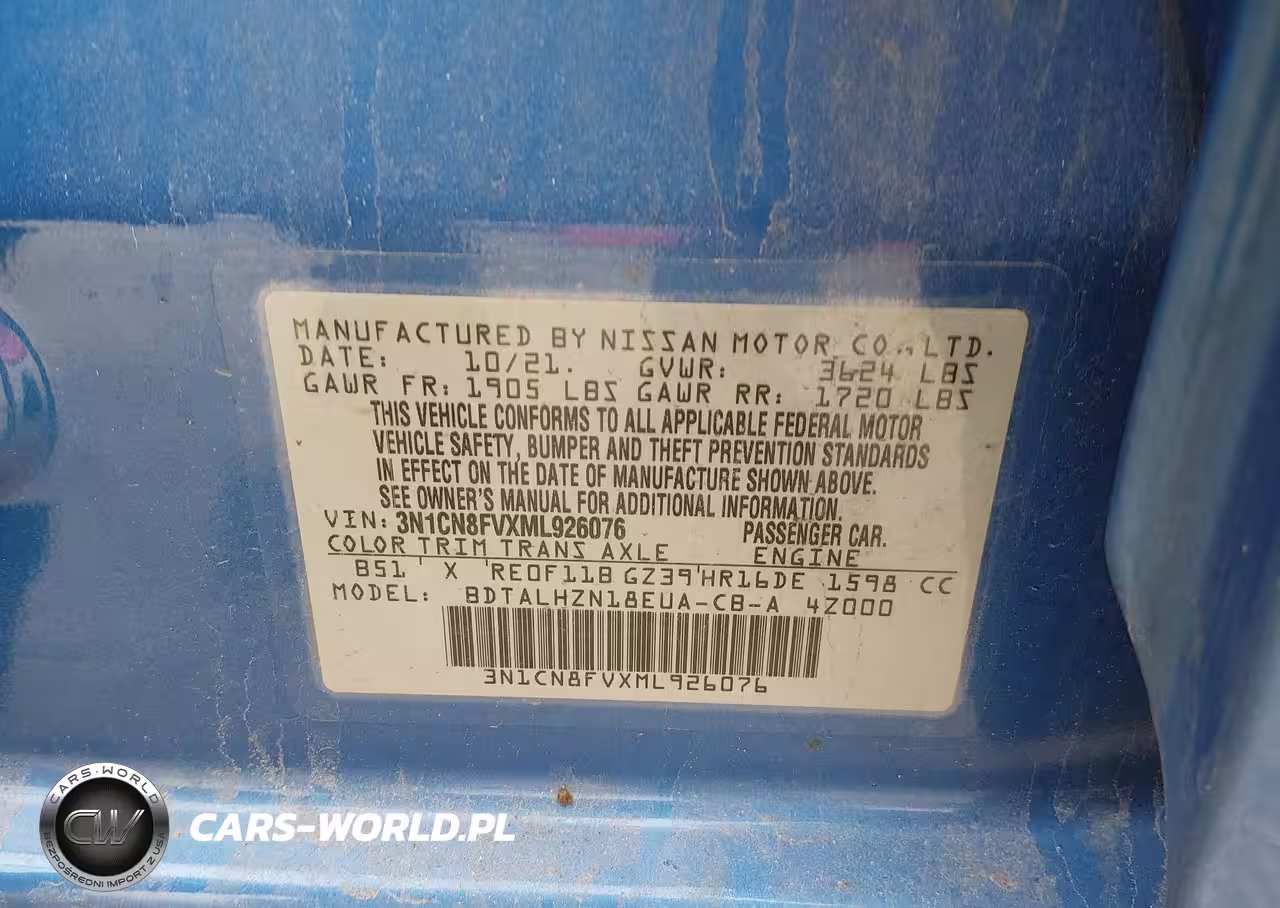 IAAI Nr: I-44574518 VIN: 3N1CN8FVXML926076 Port: Indianapolis, IN