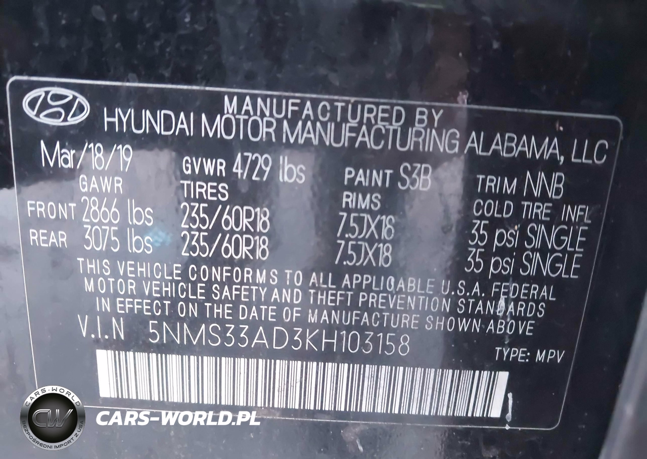 IAAI Nr: I-44575043 VIN: 5NMS33AD3KH103158 Port: Savannah, GA