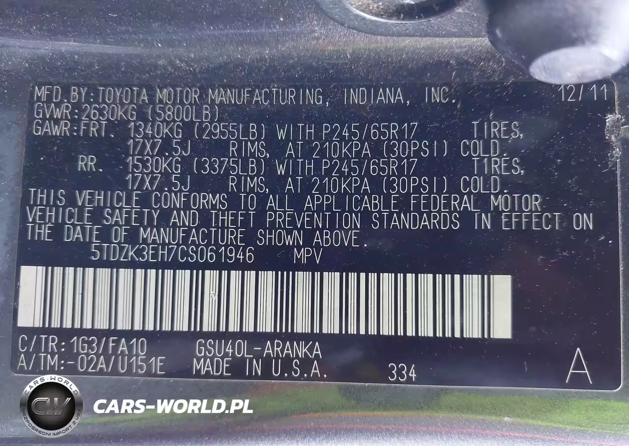 IAAI Nr: I-44580090 VIN: 5TDZK3EH7CS061946 Port: Los Angeles, CA