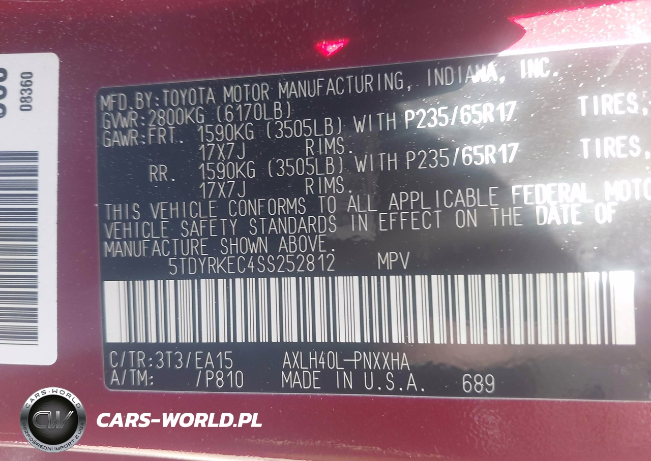 IAAI Nr: I-44581383 VIN: 5TDYRKEC4SS252812 Port: Savannah, GA