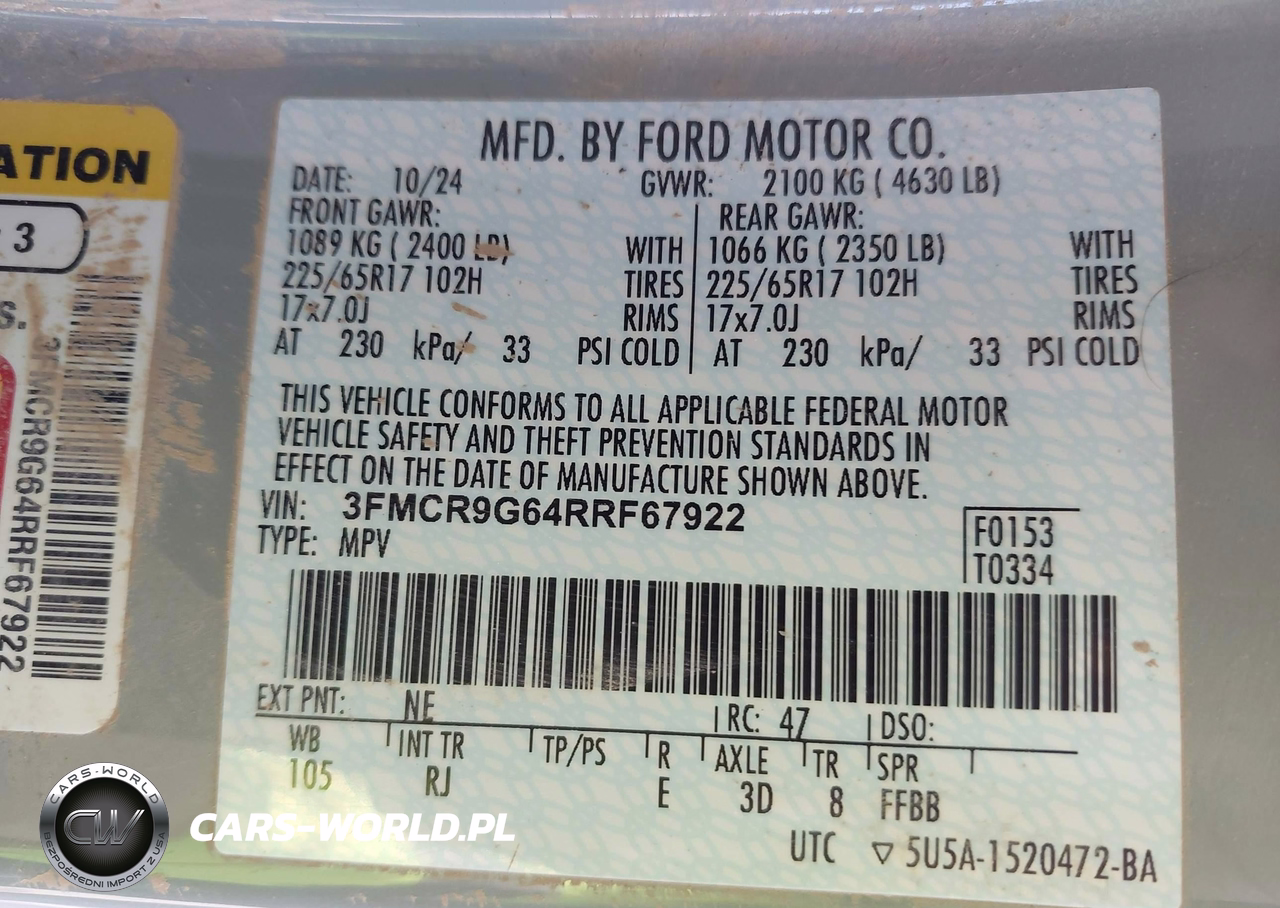 IAAI Nr: I-44588101 VIN: 3FMCR9G64RRF67922 Port: Indianapolis, IN