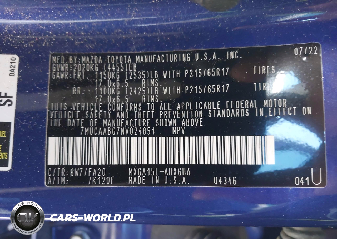 IAAI Nr: I-44588683 VIN: 7MUCAABG7NV024851 Port: Savannah, GA