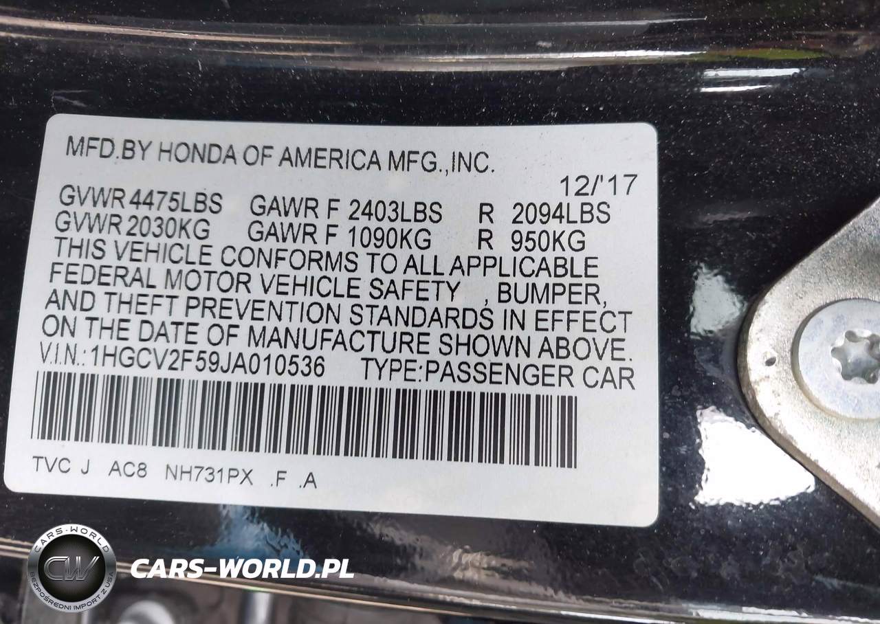 IAAI Nr: I-44593416 VIN: 1HGCV2F59JA010536 Port: Elizabeth, NJ