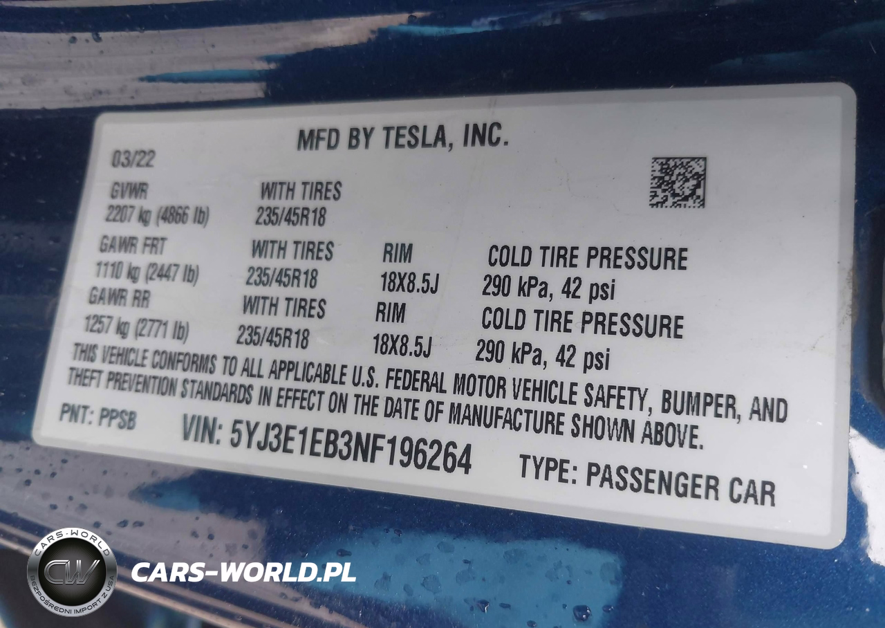 IAAI Nr: I-44593725 VIN: 5YJ3E1EB3NF196264 Port: Elizabeth, NJ