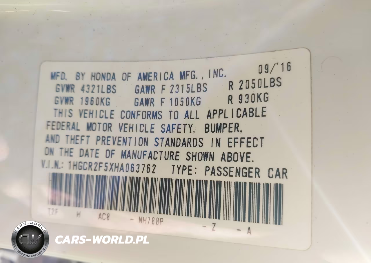 IAAI Nr: I-44593777 VIN: 1HGCR2F5XHA063762 Port: Houston, TX