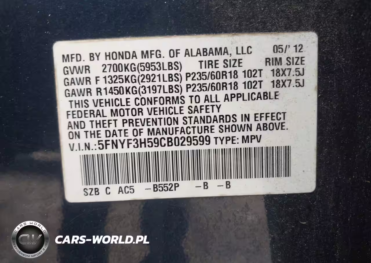 IAAI Nr: I-44596836 VIN: 5FNYF3H59CB029599 Port: Savannah, GA