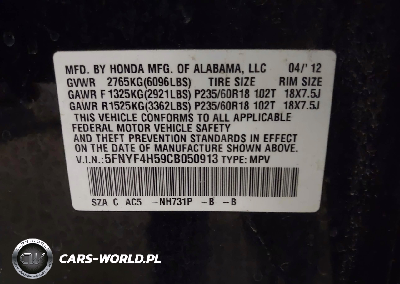 IAAI Nr: I-44601660 VIN: 5FNYF4H59CB050913 Port: Indianapolis, IN