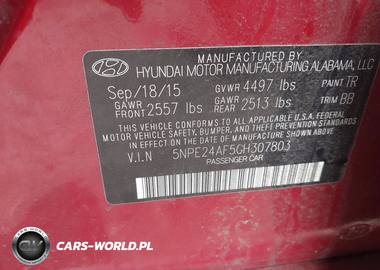 IAAI Nr: I-44603675 VIN: 5NPE24AF5GH307803 Port: Elizabeth, NJ