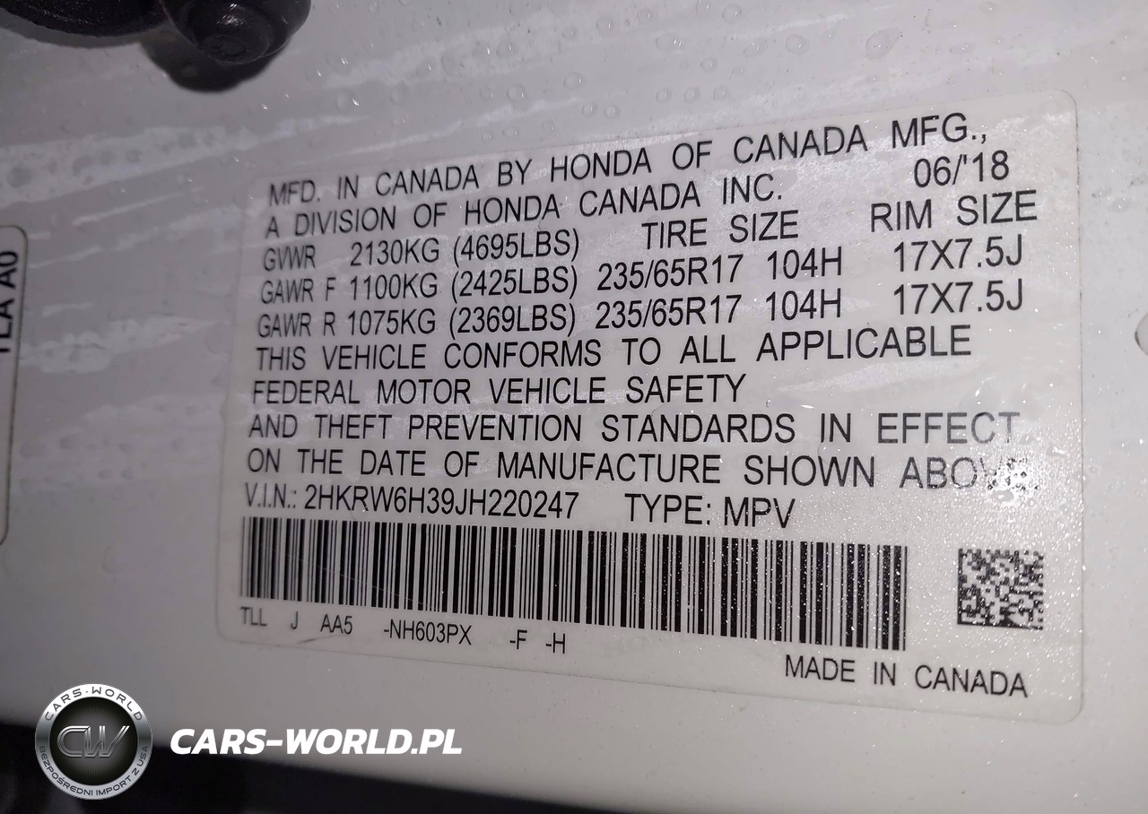 IAAI Nr: I-44605688 VIN: 2HKRW6H39JH220247 Port: Elizabeth, NJ