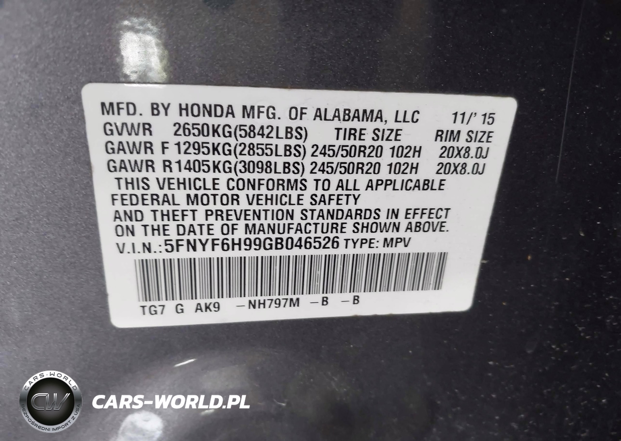 IAAI Nr: I-44606063 VIN: 5FNYF6H99GB046526 Port: Elizabeth, NJ