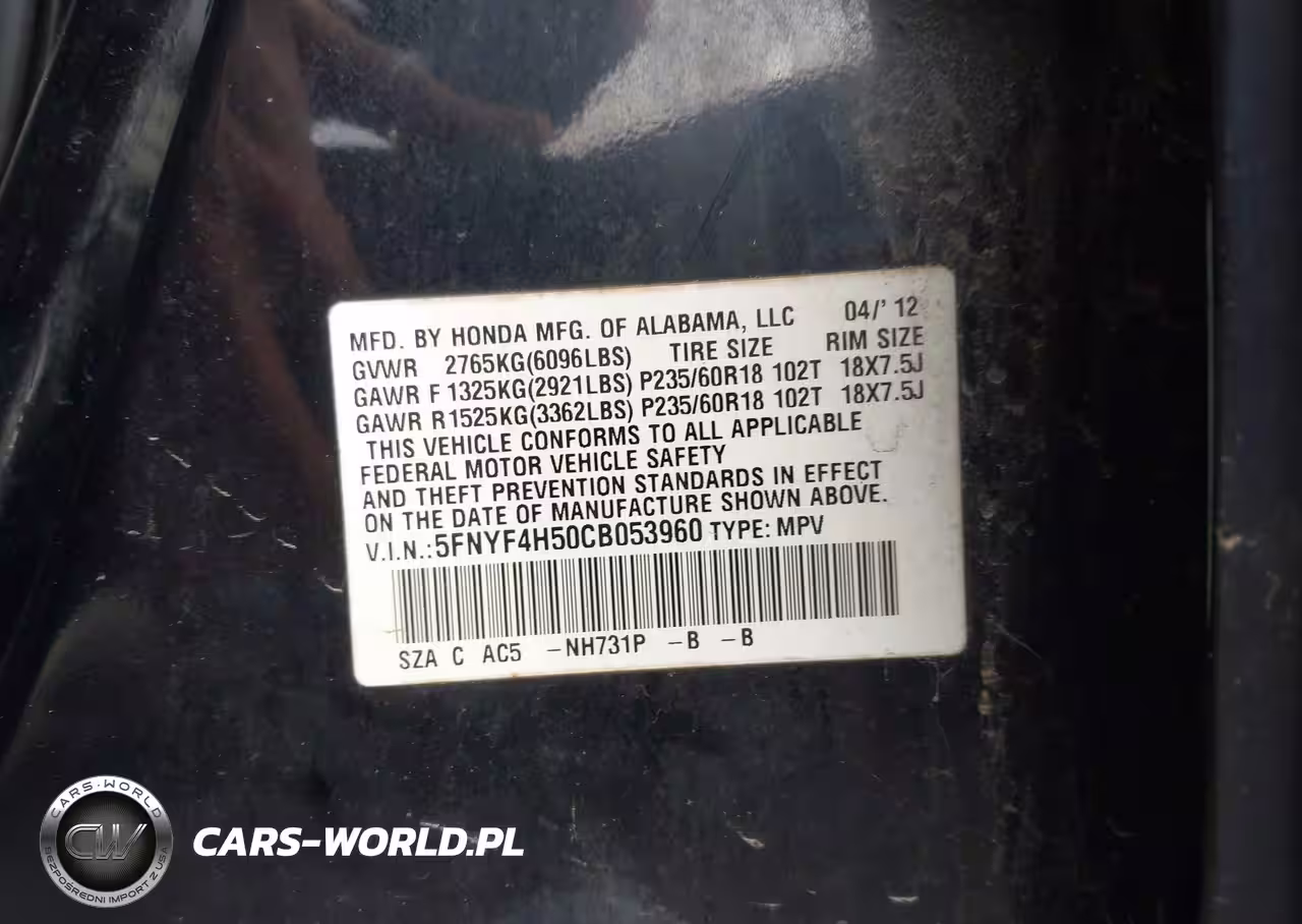 IAAI Nr: I-44611984 VIN: 5FNYF4H50CB053960 Port: Elizabeth, NJ