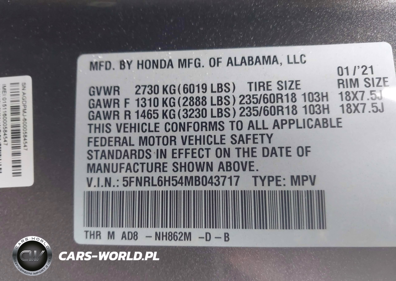 IAAI Nr: I-44614948 VIN: 5FNRL6H54MB043717 Port: Indianapolis, IN