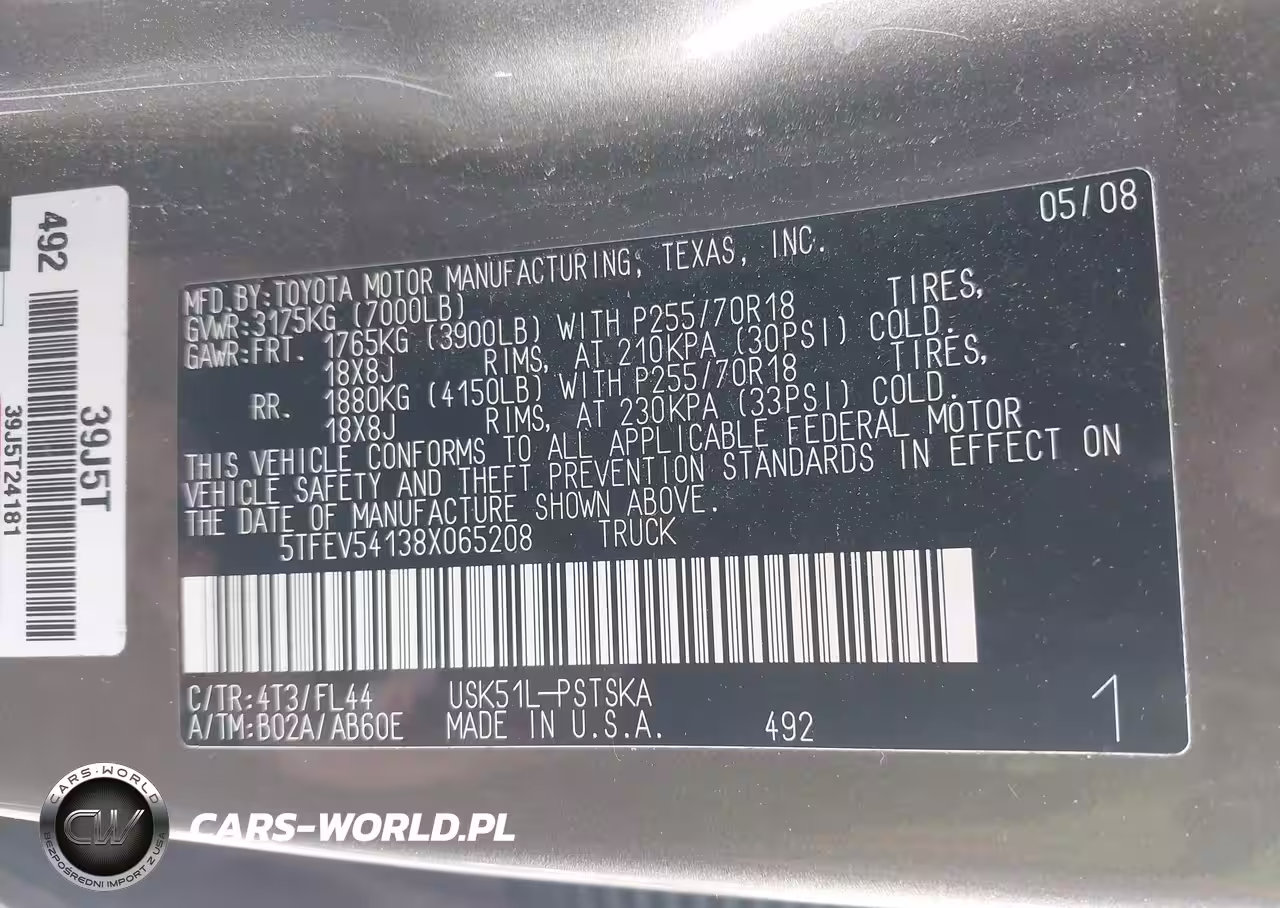 IAAI Nr: I-44616066 VIN: 5TFEV54138X065208 Port: Houston, TX