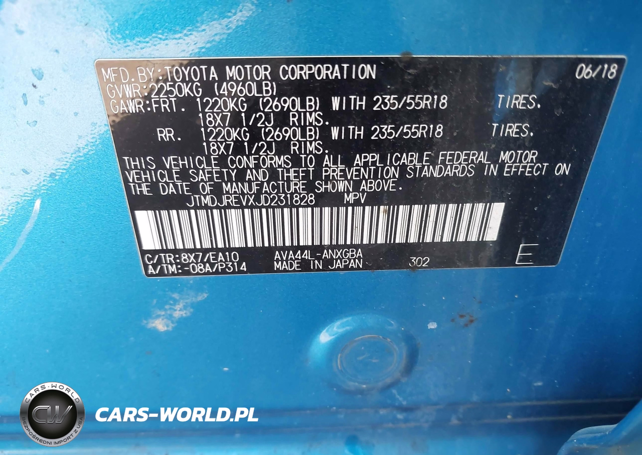 IAAI Nr: I-44624829 VIN: JTMDJREVXJD231828 Port: Elizabeth, NJ