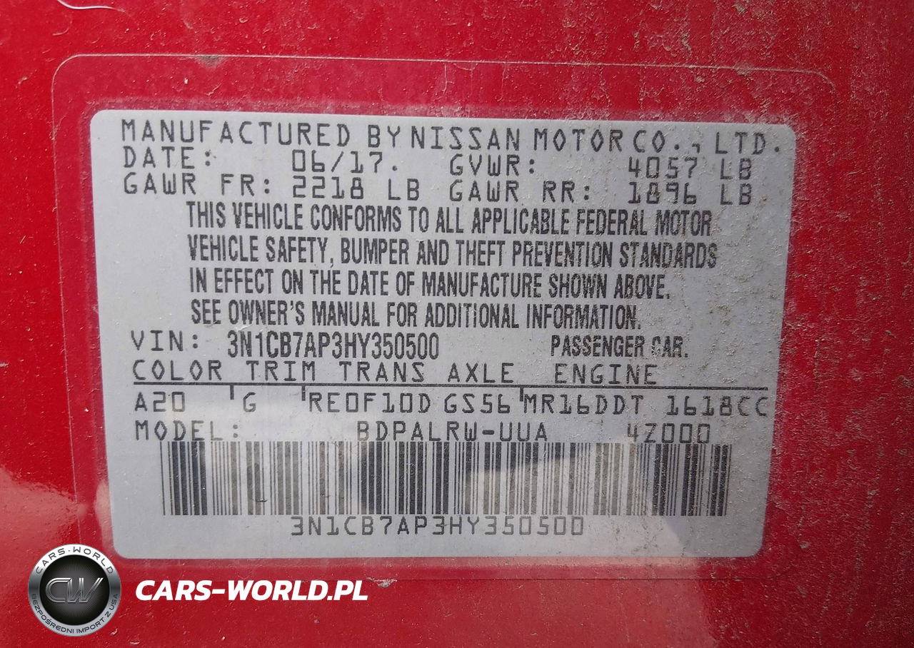 IAAI Nr: I-44628130 VIN: 3N1CB7AP3HY350500 Port: Elizabeth, NJ