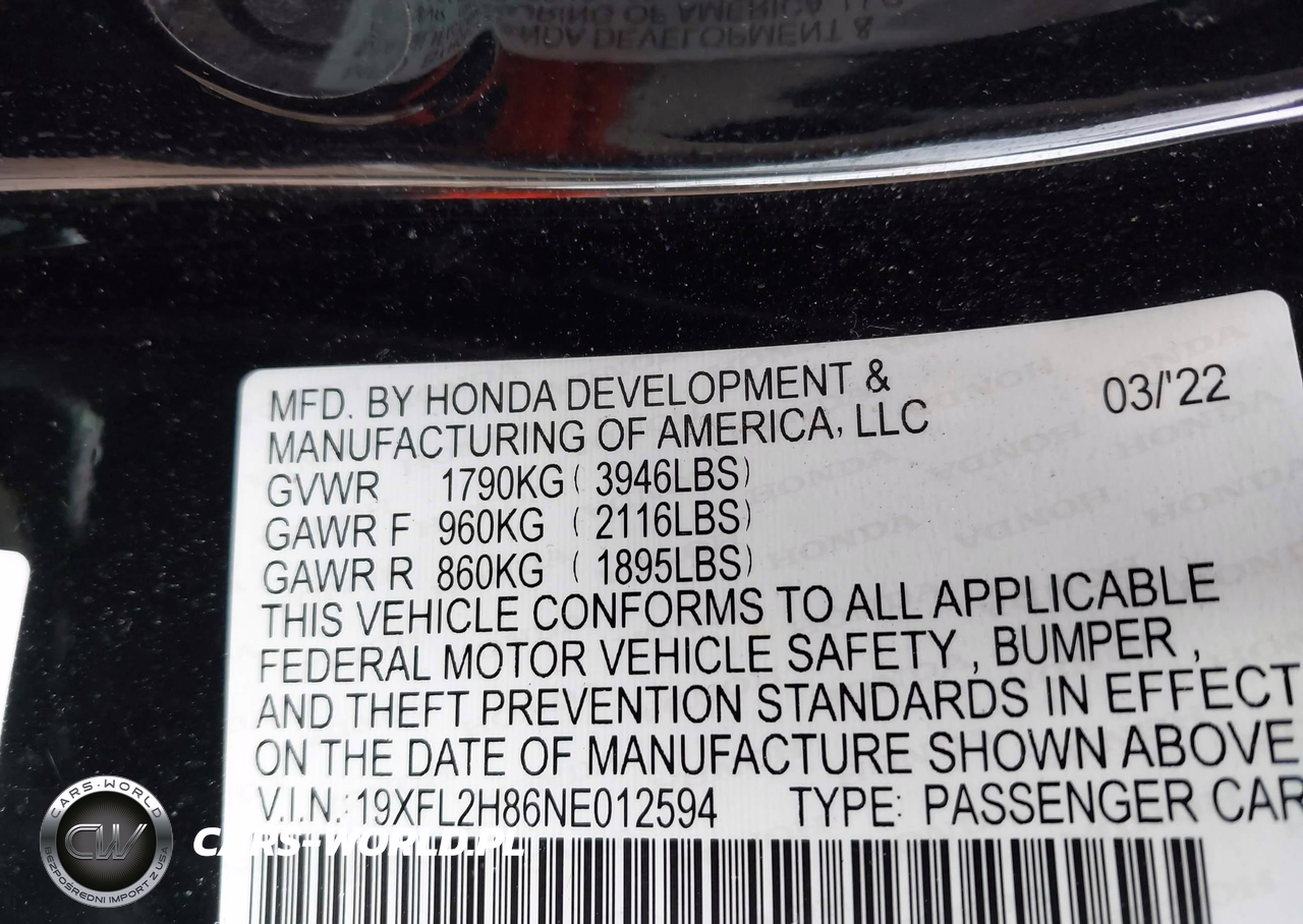 IAAI Nr: I-44631136 VIN: 19XFL2H86NE012594 Port: Indianapolis, IN