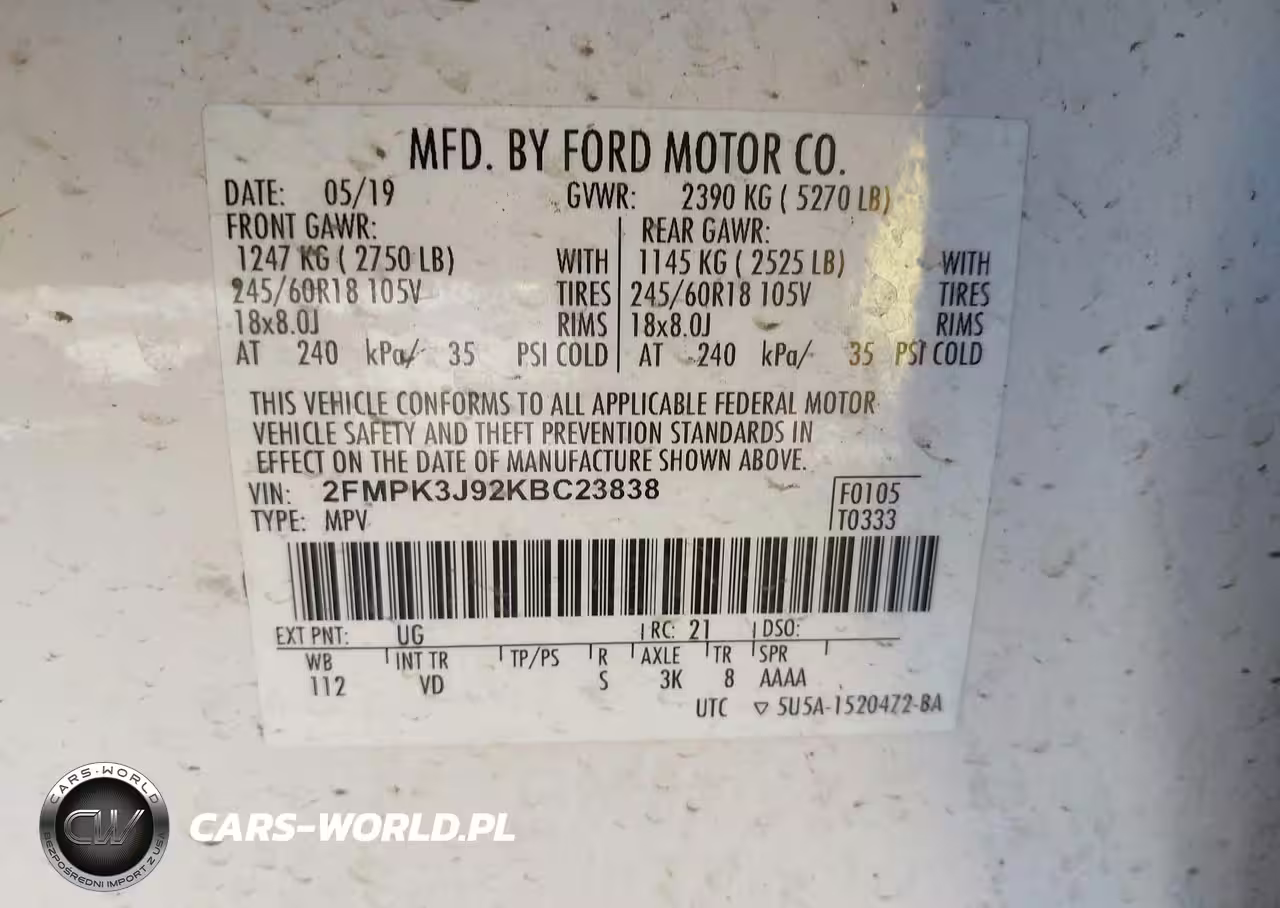 IAAI Nr: I-44636115 VIN: 2FMPK3J92KBC23838 Port: Los Angeles, CA