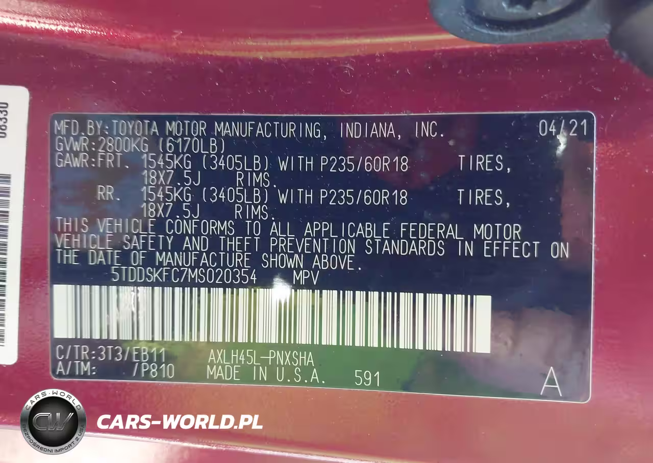 IAAI Nr: I-44640204 VIN: 5TDDSKFC7MS020354 Port: Indianapolis, IN
