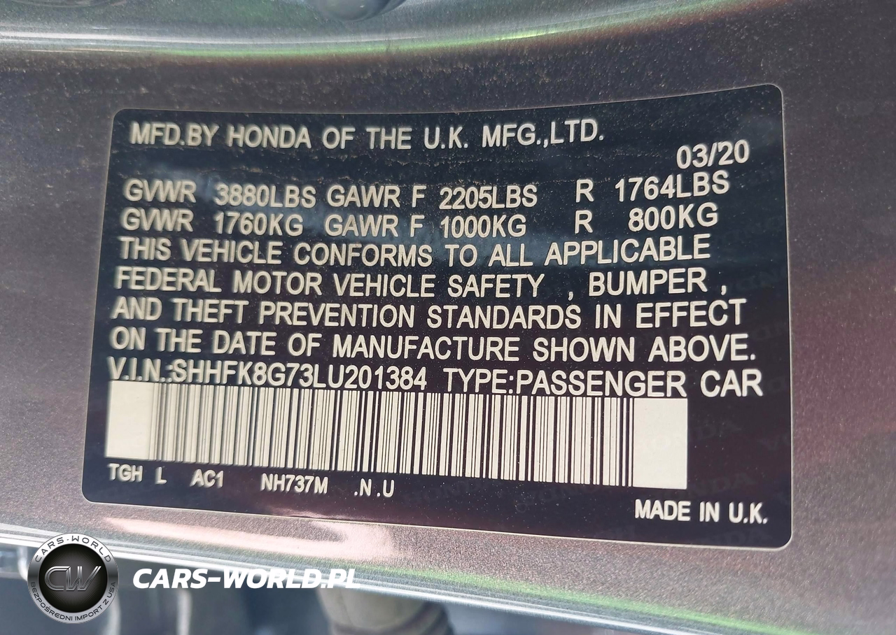 IAAI Nr: I-44646892 VIN: SHHFK8G73LU201384 Port: Los Angeles, CA