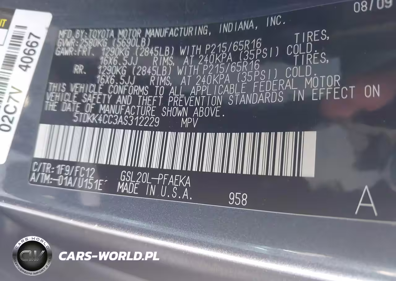 IAAI Nr: I-44646989 VIN: 5TDKK4CC3AS312229 Port: Los Angeles, CA