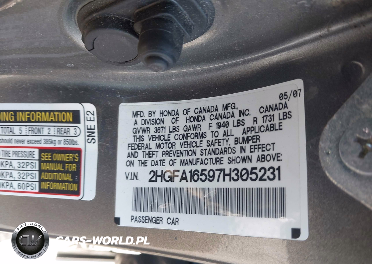 IAAI Nr: I-44651892 VIN: 2HGFA16597H305231 Port: Elizabeth, NJ