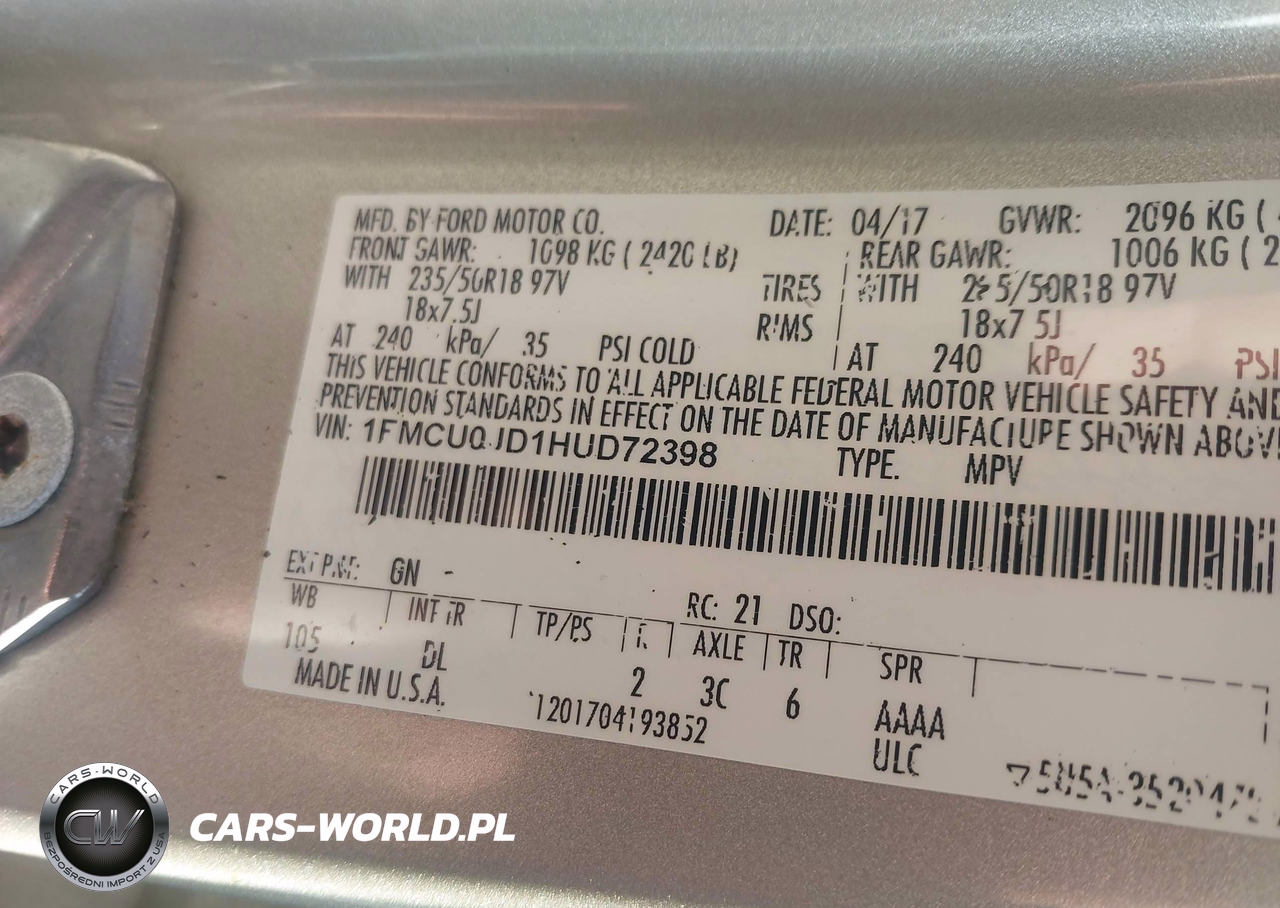 IAAI Nr: I-44652126 VIN: 1FMCU0JD1HUD72398 Port: Savannah, GA