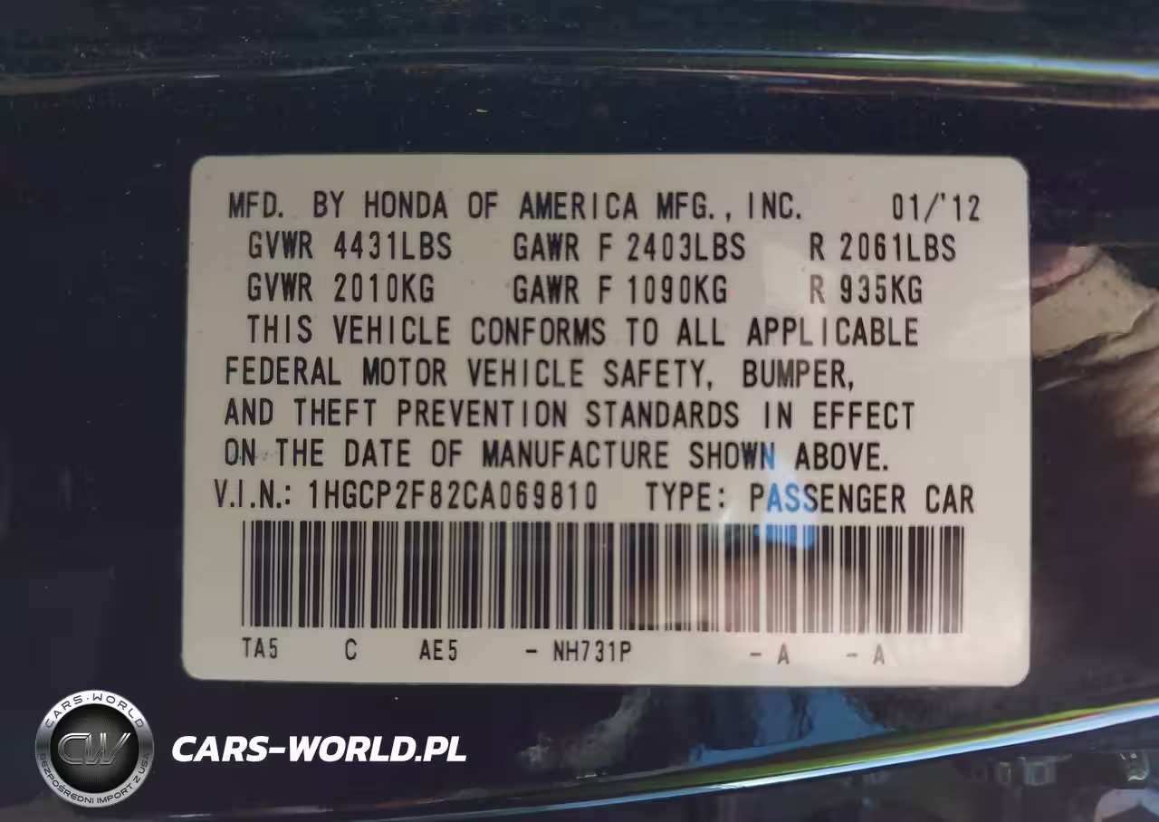 IAAI Nr: I-44660280 VIN: 1HGCP2F82CA069810 Port: Indianapolis, IN
