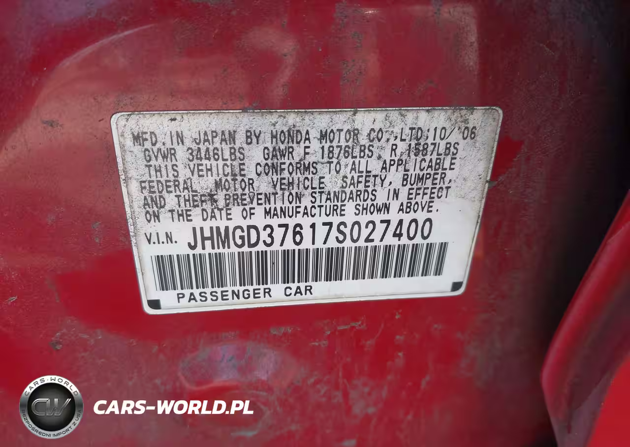IAAI Nr: I-44666439 VIN: JHMGD37617S027400 Port: Elizabeth, NJ