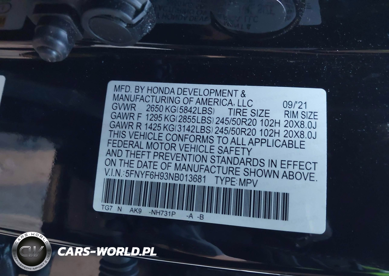 IAAI Nr: I-44666458 VIN: 5FNYF6H93NB013681 Port: Elizabeth, NJ