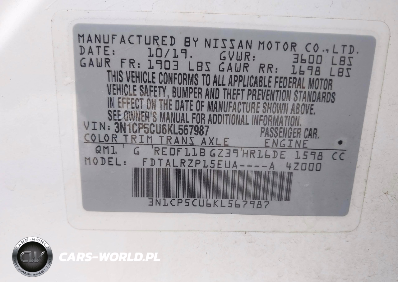 IAAI Nr: I-44670032 VIN: 3N1CP5CU6KL567987 Port: Savannah, GA