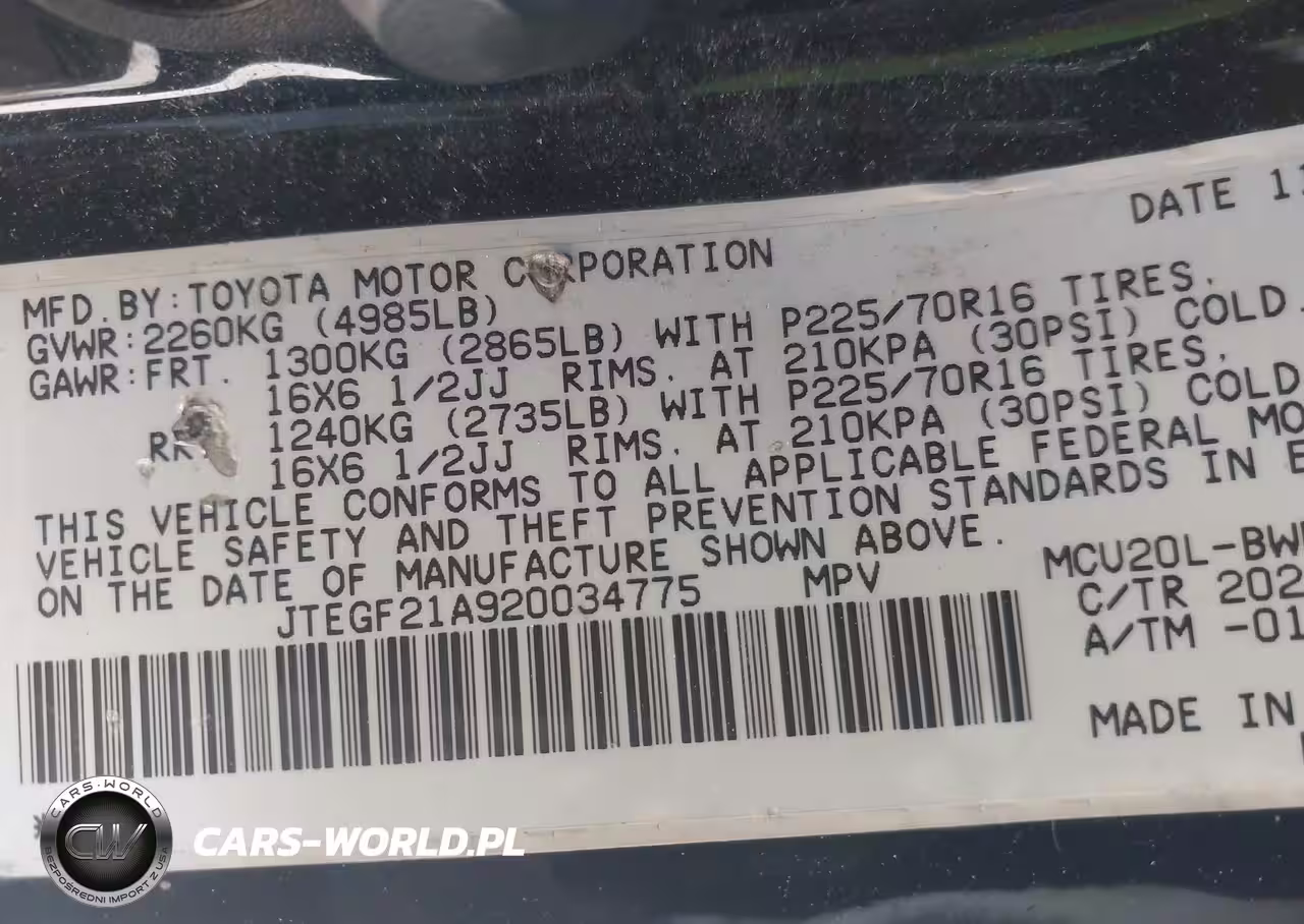 IAAI Nr: I-44671569 VIN: JTEGF21A920034775 Port: Los Angeles, CA