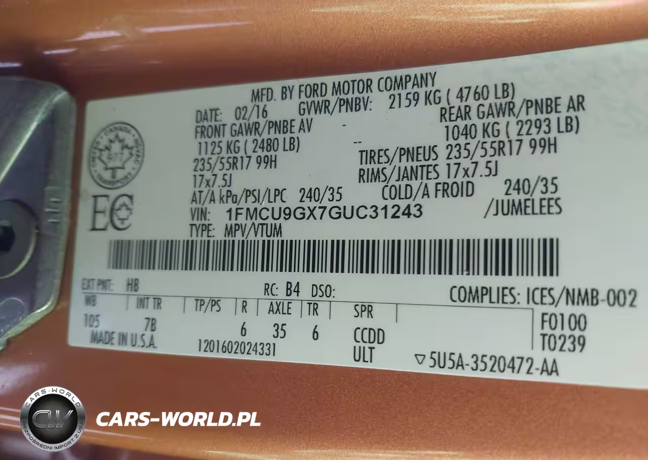IAAI Nr: I-44672111 VIN: 1FMCU9GX7GUC31243 Port: Los Angeles, CA