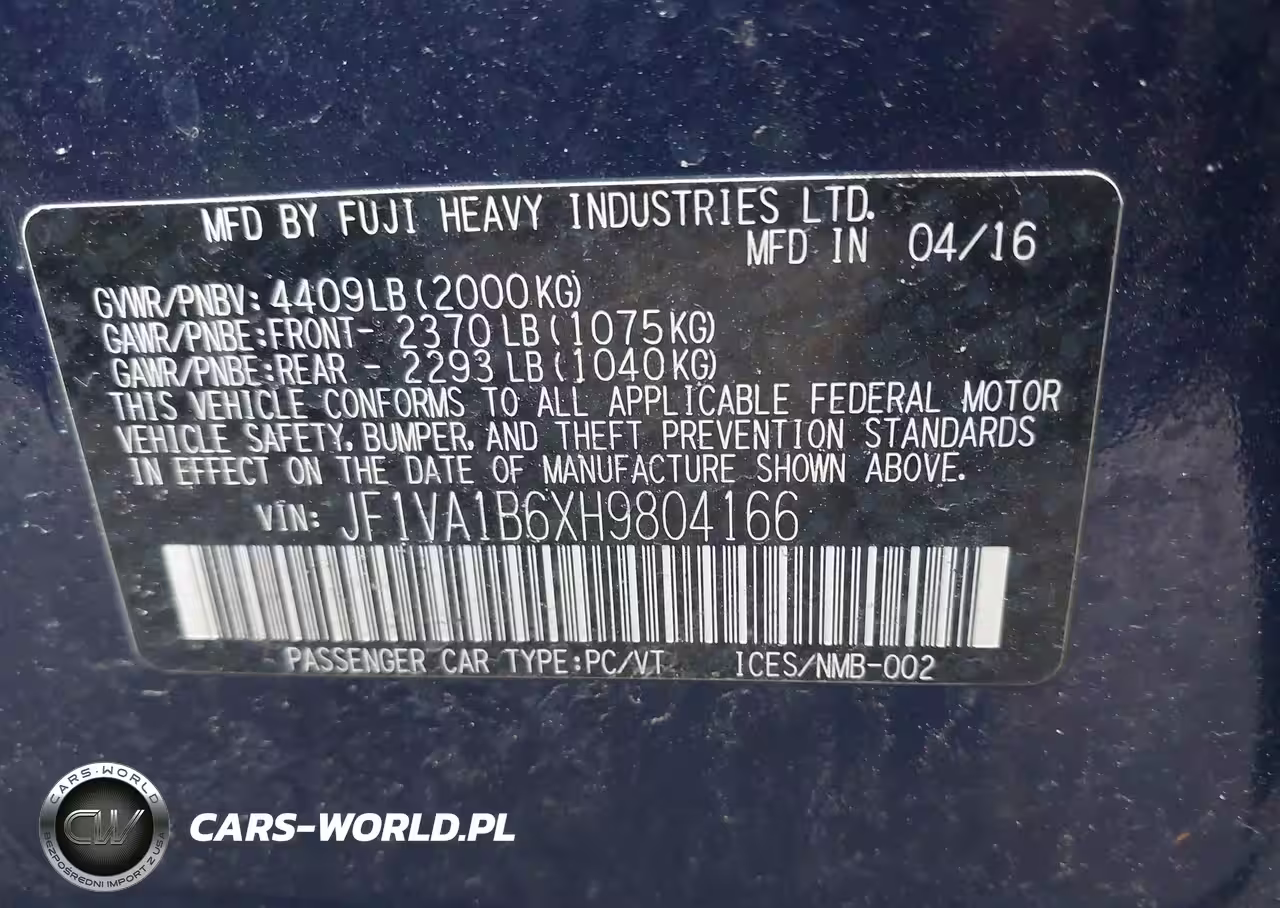 IAAI Nr: I-44676060 VIN: JF1VA1B6XH9804166 Port: Elizabeth, NJ