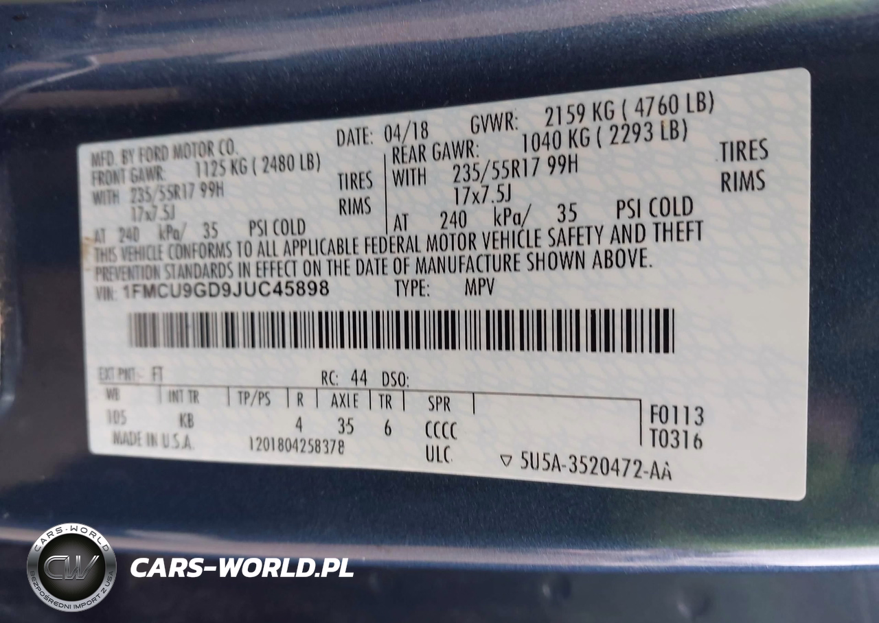 IAAI Nr: I-44677622 VIN: 1FMCU9GD9JUC45898 Port: Indianapolis, IN
