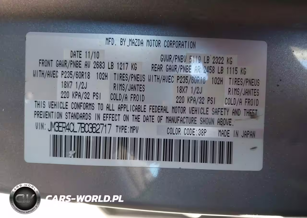 IAAI Nr: I-44678673 VIN: JM3ER4CL7B0362717 Port: Elizabeth, NJ