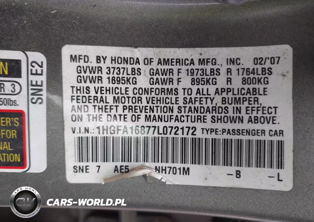IAAI Nr: I-44681845 VIN: 1HGFA16877L072172 Port: Indianapolis, IN