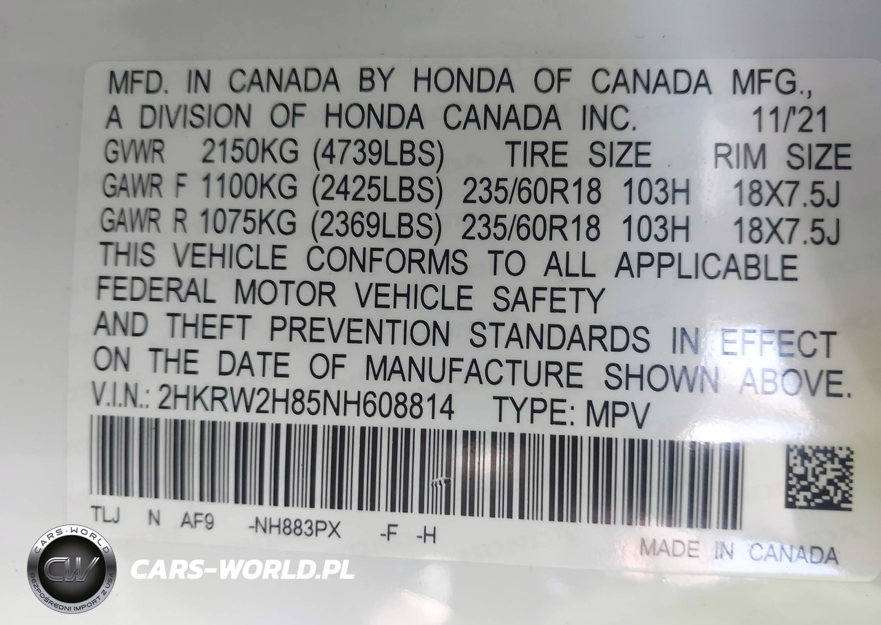 IAAI Nr: I-44688250 VIN: 2HKRW2H85NH608814 Port: Elizabeth, NJ