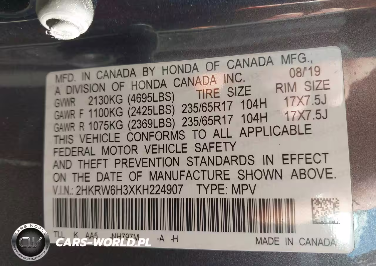 IAAI Nr: I-44690122 VIN: 2HKRW6H3XKH224907 Port: Elizabeth, NJ