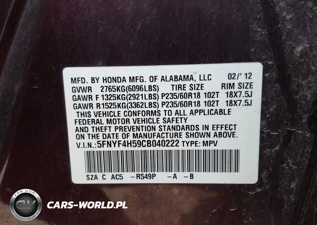 IAAI Nr: I-44695155 VIN: 5FNYF4H59CB040222 Port: Indianapolis, IN