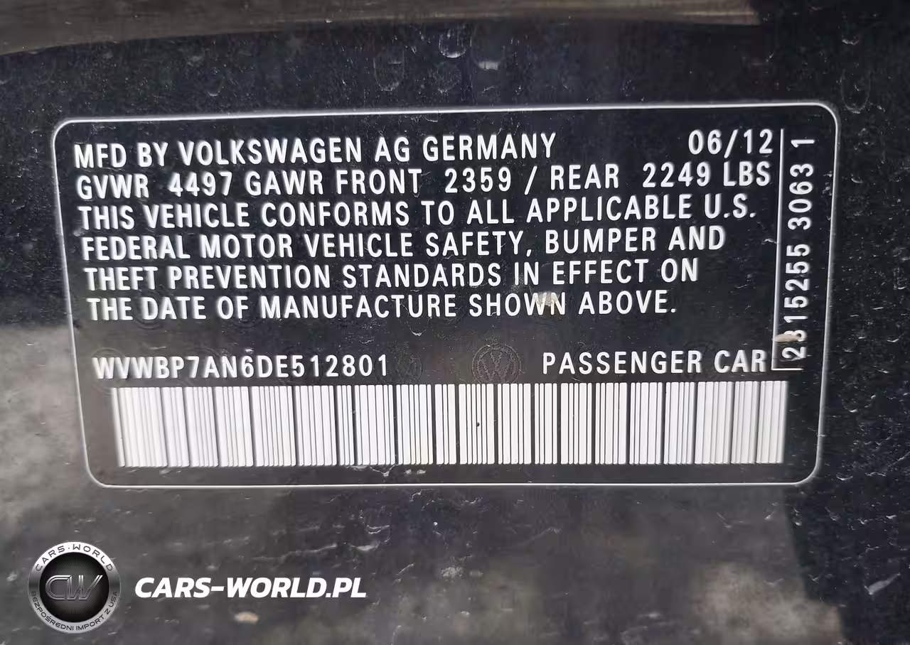 IAAI Nr: I-44696038 VIN: WVWBP7AN6DE512801 Port: Indianapolis, IN