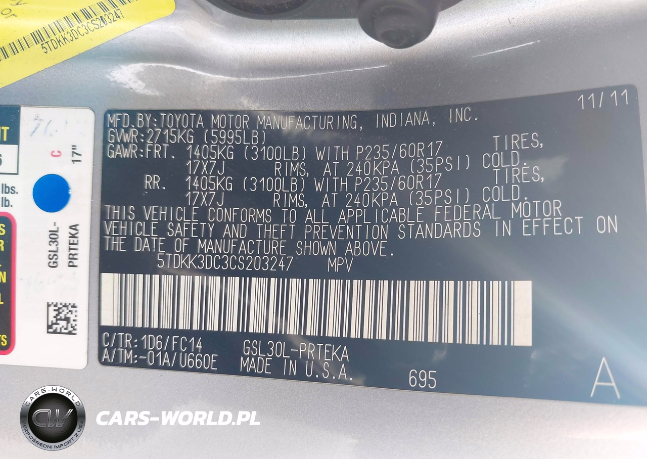 IAAI Nr: I-44703146 VIN: 5TDKK3DC3CS203247 Port: Los Angeles, CA