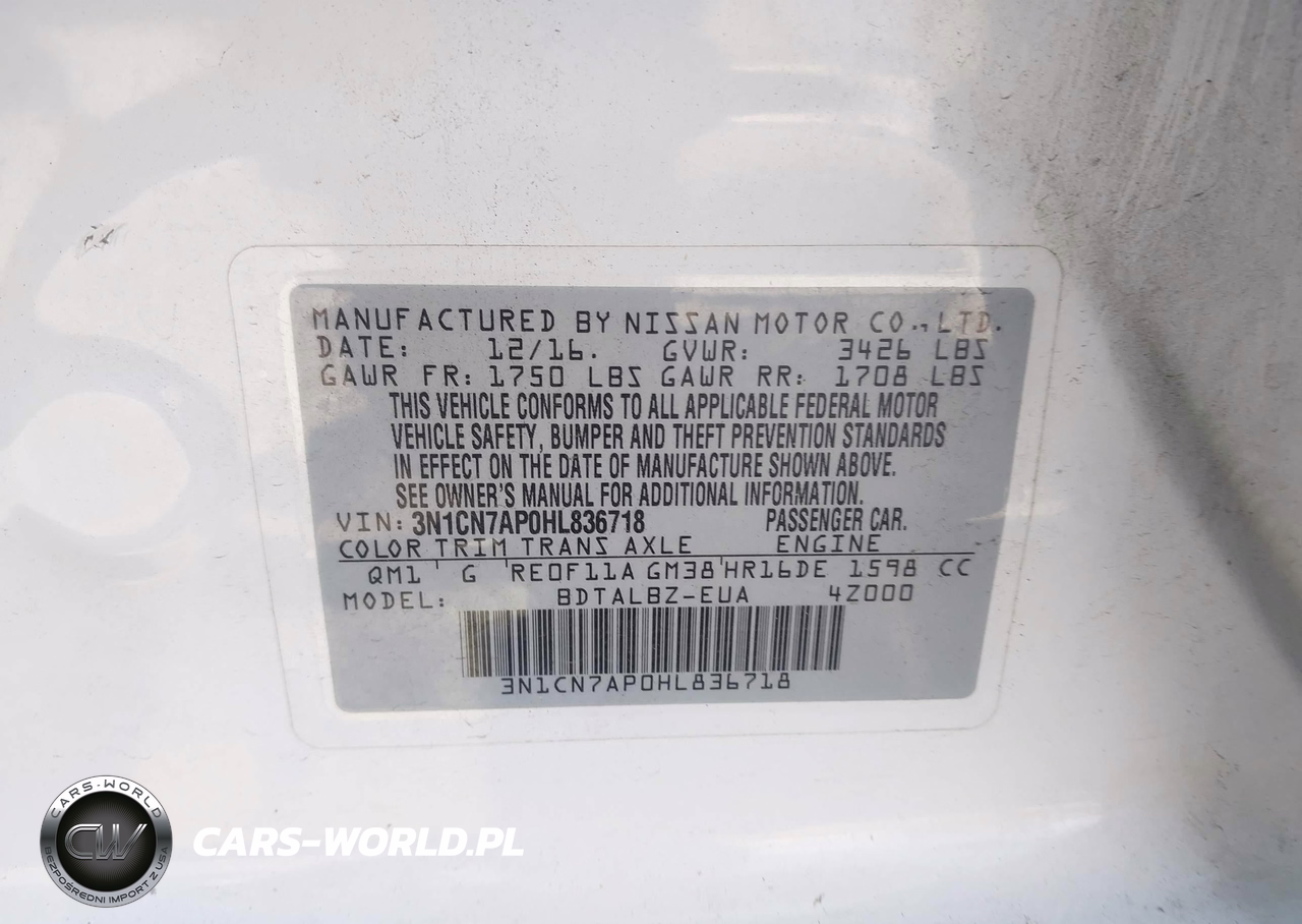 IAAI Nr: I-44709680 VIN: 3N1CN7AP0HL836718 Port: Los Angeles, CA