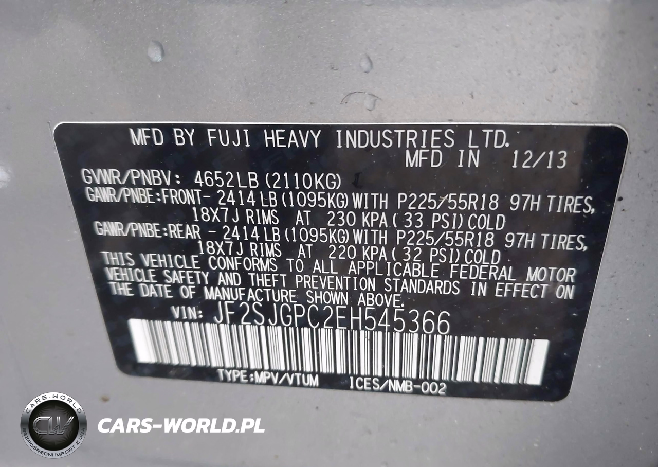 IAAI Nr: I-44716022 VIN: JF2SJGPC2EH545366 Port: Elizabeth, NJ