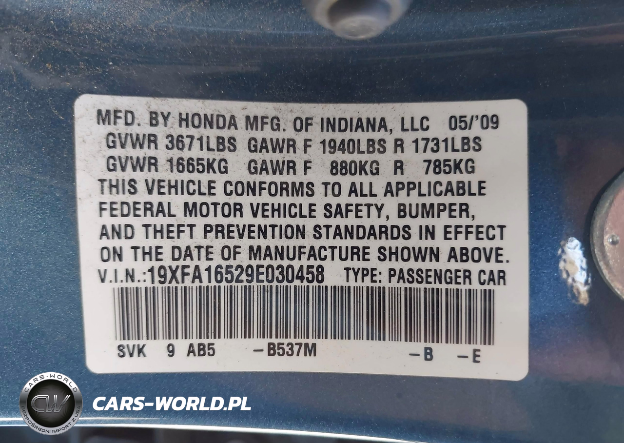 IAAI Nr: I-44716844 VIN: 19XFA16529E030458 Port: Los Angeles, CA