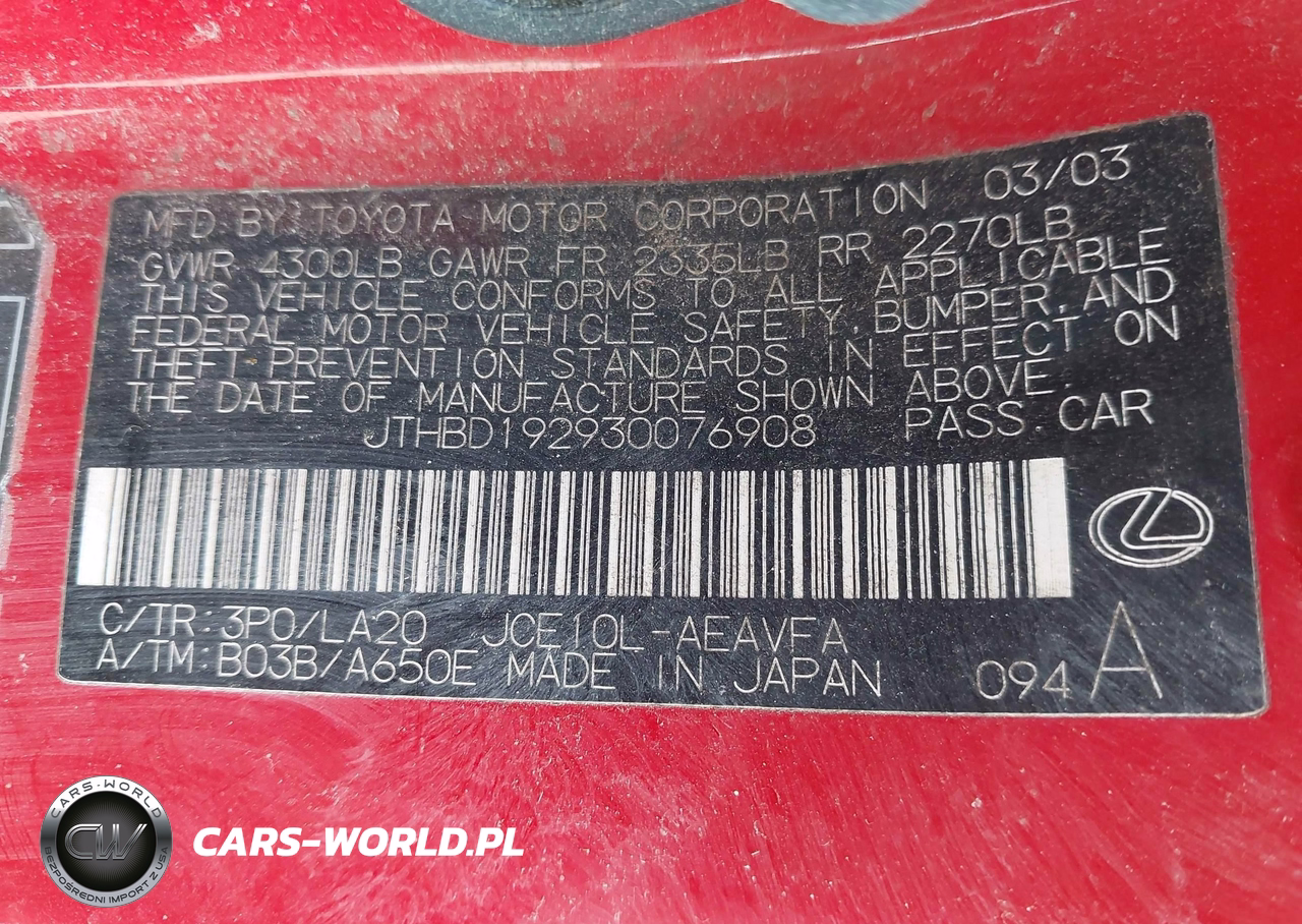 IAAI Nr: I-44717328 VIN: JTHBD192930076908 Port: Indianapolis, IN