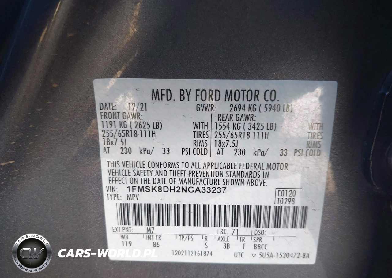 IAAI Nr: I-44717423 VIN: 1FMSK8DH2NGA33237 Port: Los Angeles, CA
