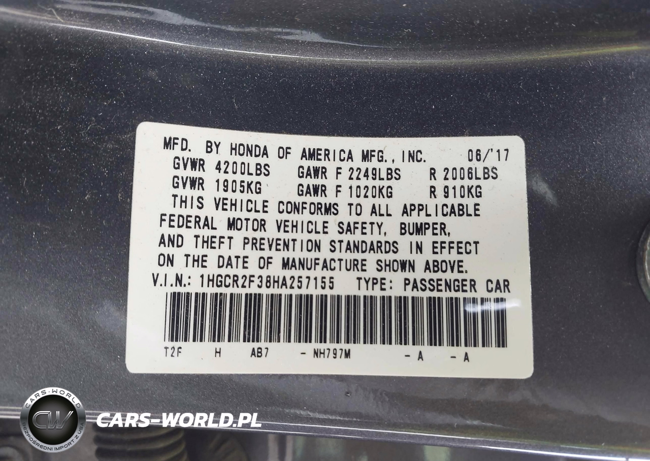 IAAI Nr: I-44718215 VIN: 1HGCR2F38HA257155 Port: Savannah, GA